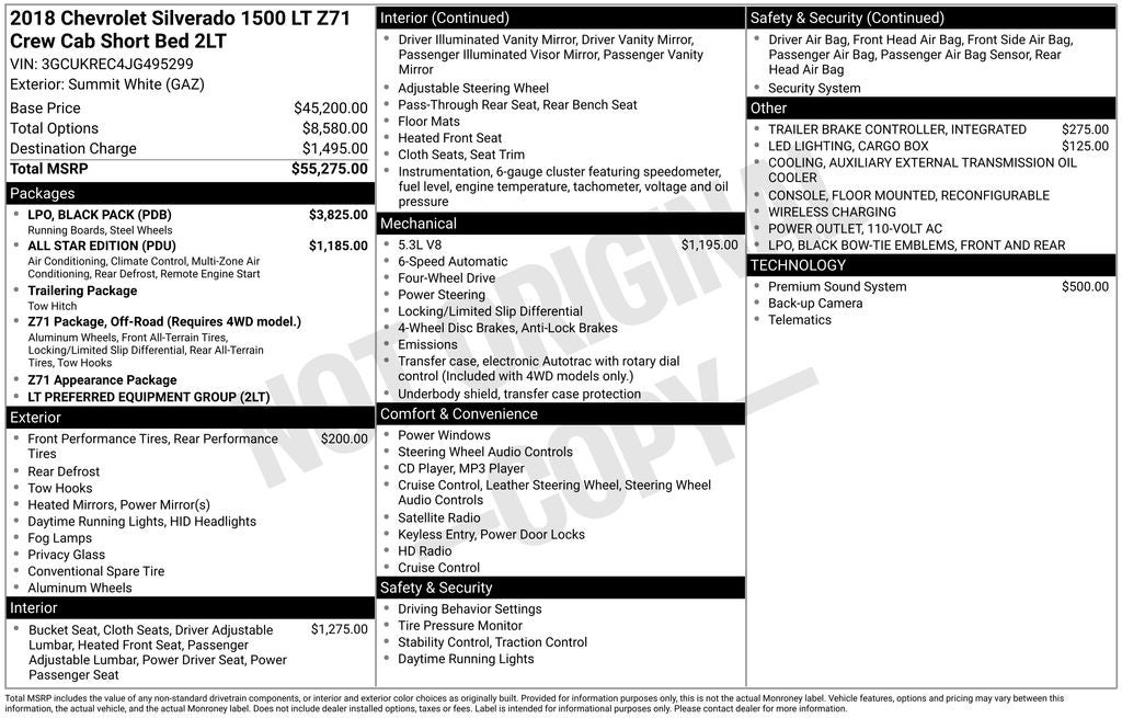 - Z71 Package, Off-Road (Requires 4WD model.), includes monotube Rancho brand shocks, (K47) air cleaner, (JHD) Hill Descent Control, (NZZ) underbody shield and (V76) recovery hooks. Also includes brushed metal Z71 door sill plate, unique Z71 gauge cluster, unique finish interior trim plates, unique lower bumper appearance, unique grille design with Z71 badge and Z71 pickup box decals (Includes (Z82) Trailering Package, (G80) locking rear differential and (RD1) 18" bright machined wheels and (RBX) 18" tires. Upgradeable to (RD4) 20" polished-aluminum wheels or 22" LPO wheels. (RD1) 18" bright machined wheels will be replaced with (RX1) 22" LPO wheels when (PDD) Local Market Package (Double Cab), LPO or (PDD) Local Market Package (Crew Cab), LPO is ordered.)