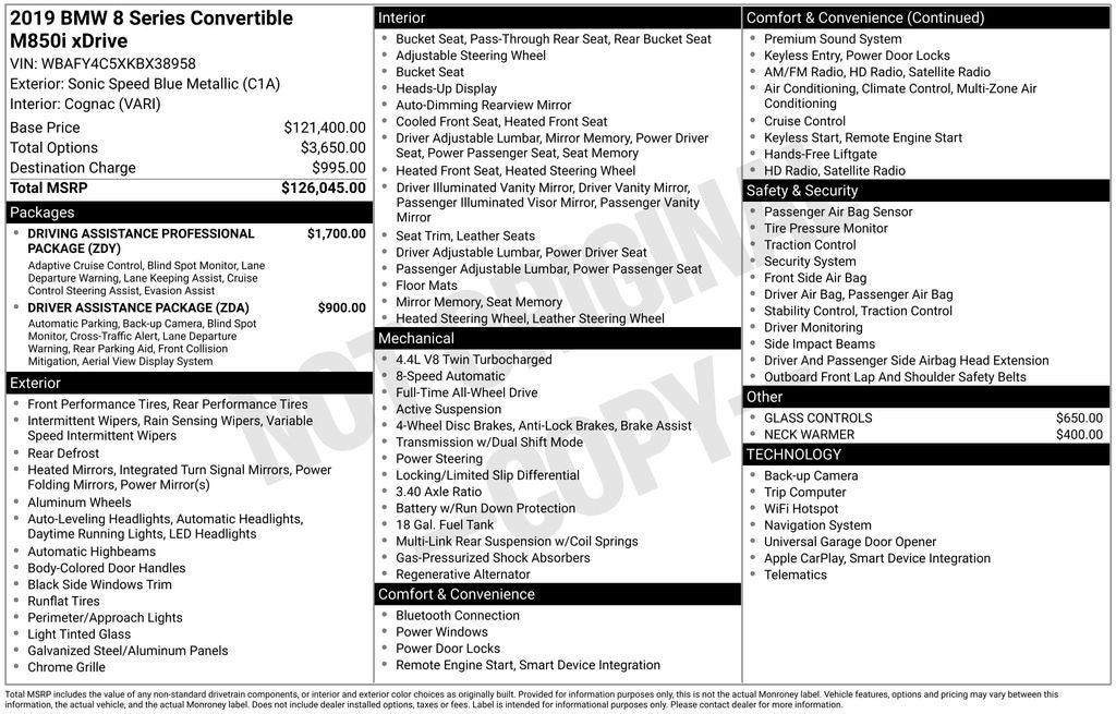 16 Speakers, Active Blind Spot Detection, Active Driving Assistant Pro, Adaptive suspension, AM/FM radio: SiriusXM, Apple CarPlay, Auto High-beam Headlights, Automatic temperature control, Driver Assistance Package, Driving Assistance Professional Package, Emergency communication system: BMW Assist eCall, Extended Traffic Jam Assistant, Front dual zone A/C, Front Ventilated Seats, Frontal Collision Warning, Fully automatic headlights, Garage door transmitter, Glass Controls, Glass rear window, harman/kardon Surround Sound System, Heads-Up Display, Heated door mirrors, Heated Front Seats w/Armrests & Steering Wheel, Heated steering wheel, Individual Extended Merino Leather Upholstery, Lane Departure Warning System, Leather Shift Knob, Leather steering wheel, Memory seat, Multi-Functional Seats, Navigation System, Neck Warmer, Parking Assistant Plus, Power convertible roof, Rain sensing wipers, Rear-View Camera, Remote Engine Start, Security system, Sport steering wheel, Surround View w/3D View, Wheels: 20 x 8 Fr & 20 x 9 Rr Orbit Grey, WiFi Hotspot, Wireless Charging.