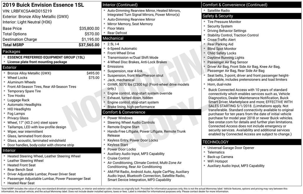 Bronze Alloy Metallic 2019 Buick Envision Essence FWD 2.5L 4-Cylinder DGI DOHC VVT 6-Speed Automatic