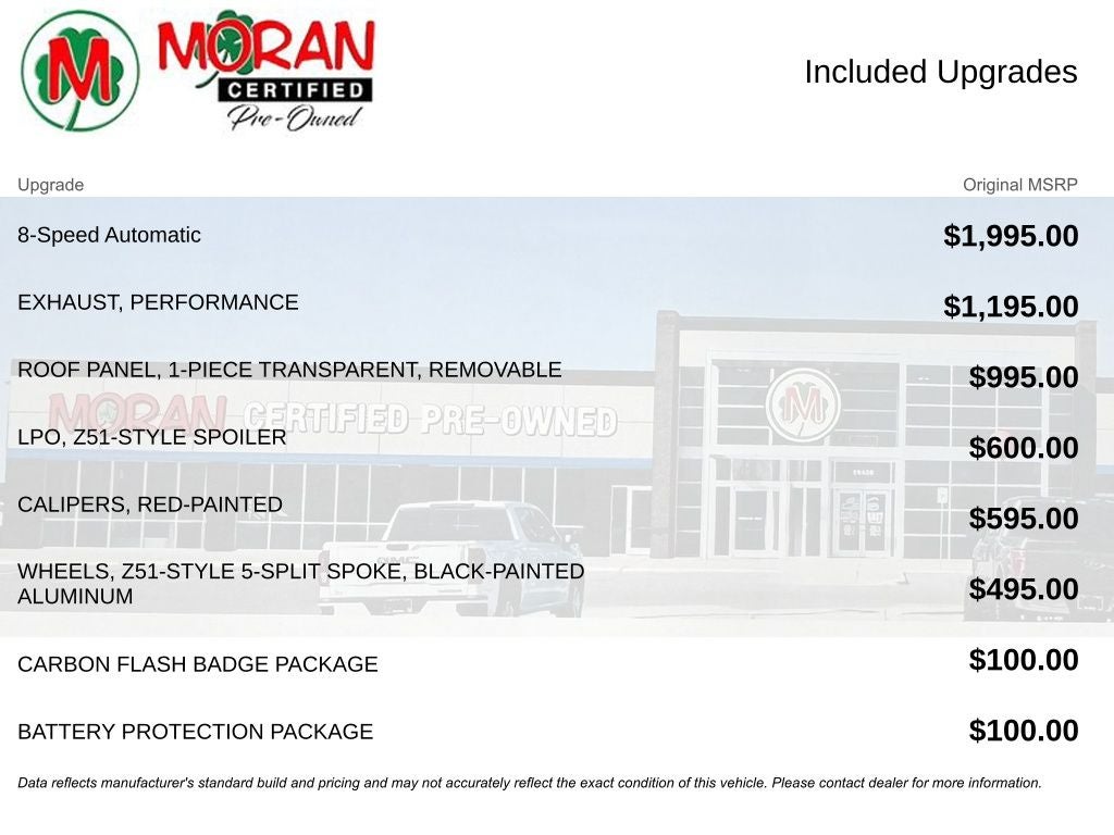 1-Piece Removable Transparent Roof Panel, 8-Way Driver & Passenger Seat Adjusters, Apple CarPlay/Android Auto, Automatic temperature control, Bose Premium 9-Speaker Audio System Feature, Carbon Flash Badge Package, Emergency communication system, Exterior Parking Camera Rear, Front dual zone A/C, Fully automatic headlights, GT Bucket Seats, Heated door mirrors, High-Intensity Discharge Headlights, Leather Shift Knob, Leather steering wheel, Performance Exhaust, Power driver seat, Preferred Equipment Group 1LT, Remote Vehicle Starter System, Wheels: 19 x 8.5 Fr & 20 x 10 Rr Black-Painted, Z51-Style Spoiler (LPO).
