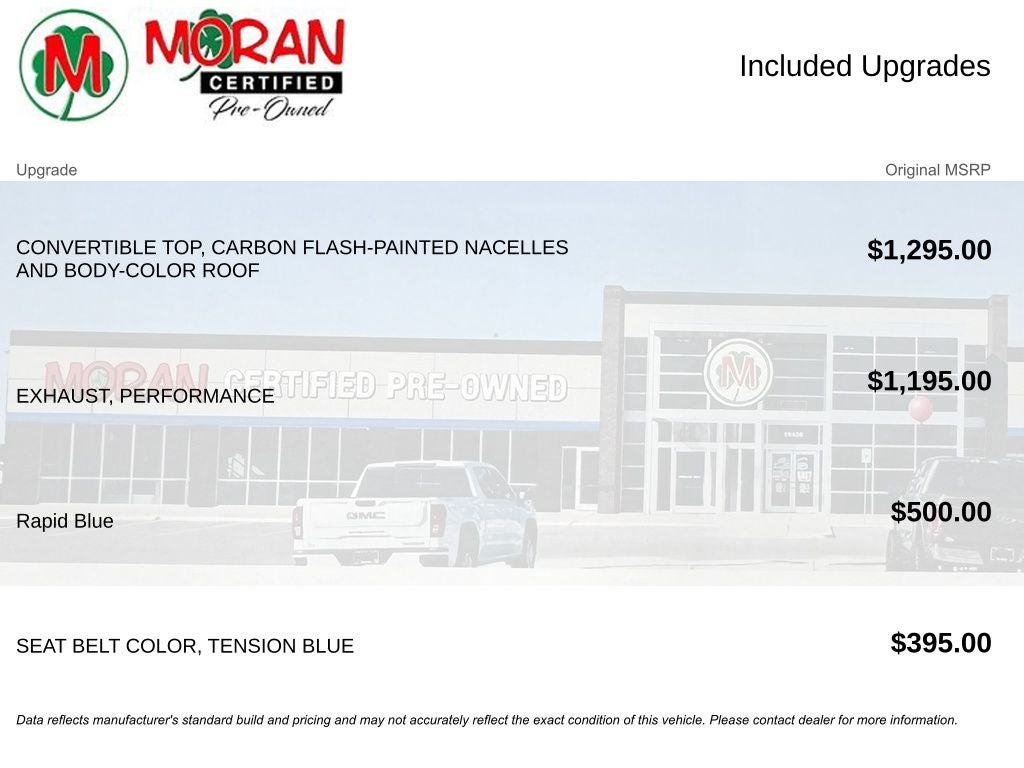 8-Way Power Driver Seat Adjuster, 8-Way Power Passenger Seat Adjuster, AM/FM radio: SiriusXM, Apple CarPlay/Android Auto, Auto-dimming Rear-View mirror, Automatic temperature control, Bose Premium 10-Speaker Audio System Feature, Convertible HardTop, Convertible Top w/Carbon Flash Nacelles, Emergency communication system: OnStar and Chevrolet connected services capable, Front dual zone A/C, Fully automatic headlights, Glass rear window, GT1 Bucket Seats, HD Radio, Illuminated entry, Leather steering wheel, Mulan Lthr Seating Surfaces w/Perforated Inserts, Performance Exhaust w/Stainless-Steel Tips, Power convertible roof, Preferred Equipment Group 1LT, Radio: Chevrolet Infotainment 3 Plus System, Rear Parking Sensors, Sport steering wheel, Tension Blue Seat Belt Color, Wheels: 19 x 8.5 Fr/20 x 11 Rr Bright Silver.