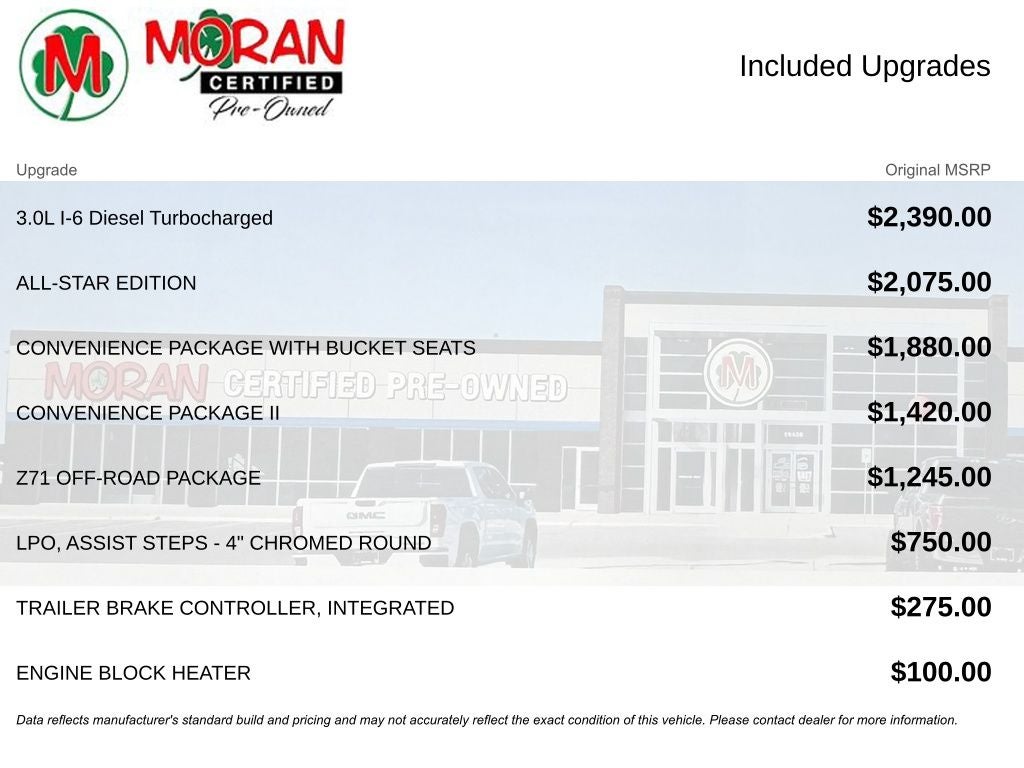 10-Speed Automatic, 4WD, Black Cloth, 10-Way Power Driver Seat w/Lumbar, 40/20/40 Front Split-Bench Seat, All-Star Edition, Bluetooth® For Phone, Cloth Rear Seat w/Storage Package, Convenience Package, Convenience Package II, Convenience Package w/Buckets Seats, Deep-Tinted Glass, Dual Exhaust w/Polished Outlets, Dual-Zone Automatic Climate Control, Electric Rear-Window Defogger, Electrical Lock Control Steering Column, Front Frame-Mounted Black Recovery Hooks, Front LED Fog Lamps, Fully automatic headlights, HD Radio, HD Rear Vision Camera, Heated Driver & Front Outboard Passenger Seats, Heated Steering Wheel, Heavy-Duty Rear Locking Differential, Hill Descent Control, Hitch Guidance, Integrated Trailer Brake Controller, Keyless Open & Start, Leather Wrapped Steering Wheel, LED Cargo Area Lighting, Off-Road Suspension, Power Sliding Rear Window w/Rear Defogger, Preferred Equipment Group 1SP, Premium Bose 7-Speaker Sound System, Radio: Chevrolet Infotainment 3 Plus System, Rear 60/40 Folding Bench Seat (Folds Up), Rear Vision Camera, Remote Vehicle Starter System, SiriusXM w/360L, Steering Wheel Mounted Electronic Cruise Control, Theft Deterrent System (Unauthorized Entry), Trailering Package, Universal Home Remote, Z71 Off-Road Package.