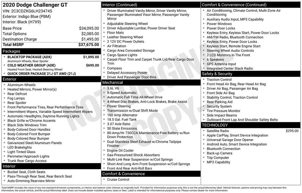 6 Speakers, Apple CarPlay/Android Auto, Automatic temperature control, AWD Rhombi Black Badge, Black Fuel Filler Door, Black Grille w/Bezel, Blacktop Package, Challenger Blacktop Grille Badge, Cold Weather Group, Front dual zone A/C, Front fog lights, Fully automatic headlights, Gloss Black I/P Cluster Trim Rings, GT Black Grille Badge, Heated Front Seats, Heated Steering Wheel, Houndstooth Cloth Performance Seats, Leather Shift Knob, ParkView Rear Back-Up Camera, Quick Order Package 21J GT AWD, Radio: Uconnect 4 w/7 Display, Rear Black Spoiler, Remote keyless entry, Satin Black Dodge Tail Lamp Badge, Security system, SiriusXM Radio Service, SiriusXM Satellite Radio, Split folding rear seat, Sport steering wheel, Wheels: 19 x 7.5 Black Noise Painted.