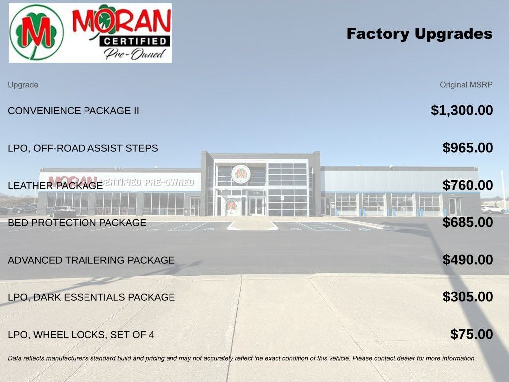 10-Way Power Driver Seat w/Lumbar, 12-Volt Rear Auxiliary Power Outlet, 120-Volt Bed Mounted Power Outlet, 120-Volt Instrument Panel Power Outlet, 170 Amp Alternator, 2 USB Ports, 2 USB Ports (First Row), 4.2 Diagonal Color Display Driver Info Center, 4G LTE Wi-Fi Hot Spot Capable, 6-Speaker Audio System, Advanced Trailering Package, Advanced Trailering System, All-Weather Floor Liner (LPO) (AAK), Auto-Locking Rear Differential, Auxiliary External Transmission Oil Cooler, Bed Protection Package, Black Name Plates (LPO), Bluetooth® For Phone, Chevrolet Connected Access Capable, Chevytec Spray-On Black Bedliner, Cloth Rear Seat w/Storage Package, Color-Keyed Carpeting Floor Covering, Compass, Convenience Package II, Convenience Package w/Buckets Seats, Dark Essentials Package (LPO), Deep-Tinted Glass, Dual Exhaust w/Polished Outlets, Dual-Zone Automatic Climate Control, Electric Rear-Window Defogger, Electrical Lock Control Steering Column, Electronic Cruise Control, EZ Lift Power Lock & Release Tailgate, Floor Mounted Center Console, Front LED Fog Lamps, HD Radio, HD Rear Vision Camera, Heated Driver & Front Outboard Passenger Seats, Heated Steering Wheel, Heavy-Duty Air Filter, High Gloss Black Grille, High Gloss Black Mirror Caps, Hill Descent Control, Hitch Guidance, Hitch Guidance w/Hitch View, Integrated Trailer Brake Controller, Keyless Open & Start, Leather Package, Leather Wrapped Steering Wheel, Leather-Appointed Front Seat Trim, LED Cargo Area Lighting, LED Reflector Headlamps, Manual Tilt/Telescoping Steering Column, OnStar & Chevrolet Connected Services Capable, Performance Red Recovery Hooks, Power Door Locks, Power Front Windows w/Driver Express Up/Down, Power Front Windows w/Passenger Express Down, Power Rear Windows w/Express Down, Power Sliding Rear Window w/Rear Defogger, Preferred Equipment Group 2LT, Premium Bose 7-Speaker Sound System, Radio: Chevrolet Infotainment 3 Plus System, Rear Dual USB Charging-Only Ports, Rear Vision Camera, Rear Wheelhouse Liners, Remote Vehicle Starter System, SiriusXM Radio, SiriusXM w/360L, Standard Tailgate, Steering Wheel Audio Controls, Suspension Package, Theft Deterrent System (Unauthorized Entry), Trailering Package, Universal Home Remote, Up-Level Rear Seat w/Storage Package, Wireless Phone Projection.