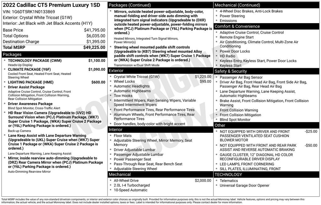 Crystal White Tricoat 2022 Cadillac CT5 Premium Luxury AWD 2.0L I4 Turbocharged DOHC 16V LEV3-SULEV30 235hp 10-Speed Automatic