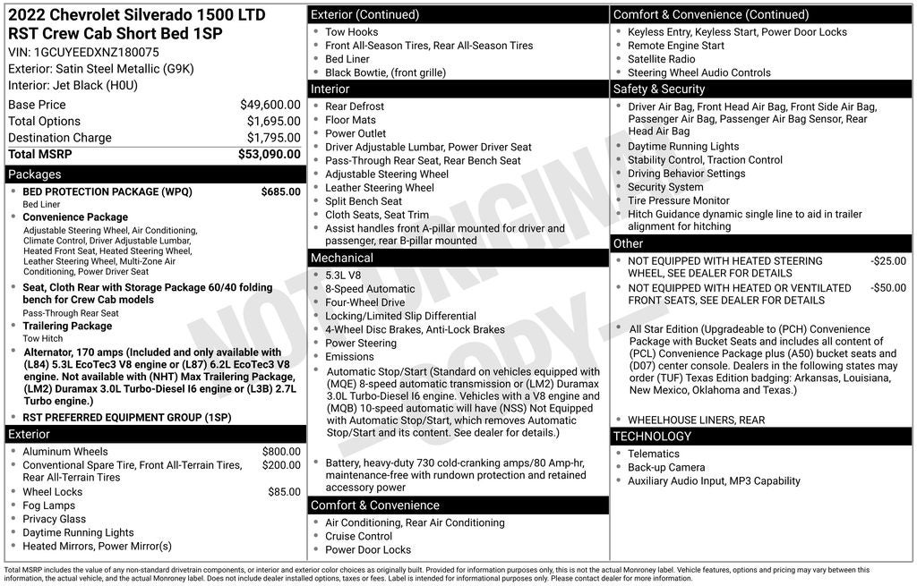 - Convenience Package includes (CJ2) dual-zone automatic climate control, (A2X) 10-way power driver seat including power lumbar, (KA1) heated driver and passenger seats, (NP5) leather-wrapped steering wheel, (KI3) heated steering wheel and (N37) manual tilt/telescoping steering column (Vehicles built prior to 11-15-2021 include heated driver and front outboard passenger seats. Certain vehicles built on or after 11-15-2021 will be forced to include (00V) Not Equipped with Heated or Ventilated Front Seats, which removes heated front seats. Vehicles built prior to 12-6-2021 include heated steering wheel. Vehicles built on or after 12-6-2021 will be forced to include (00G) Not Equipped with Heated Steering Wheel, which removes the heated steering wheel. See dealer for details or the window label for the features on a specific vehicle. Includes (R7O) Cloth Rear Seat with Storage Package.)