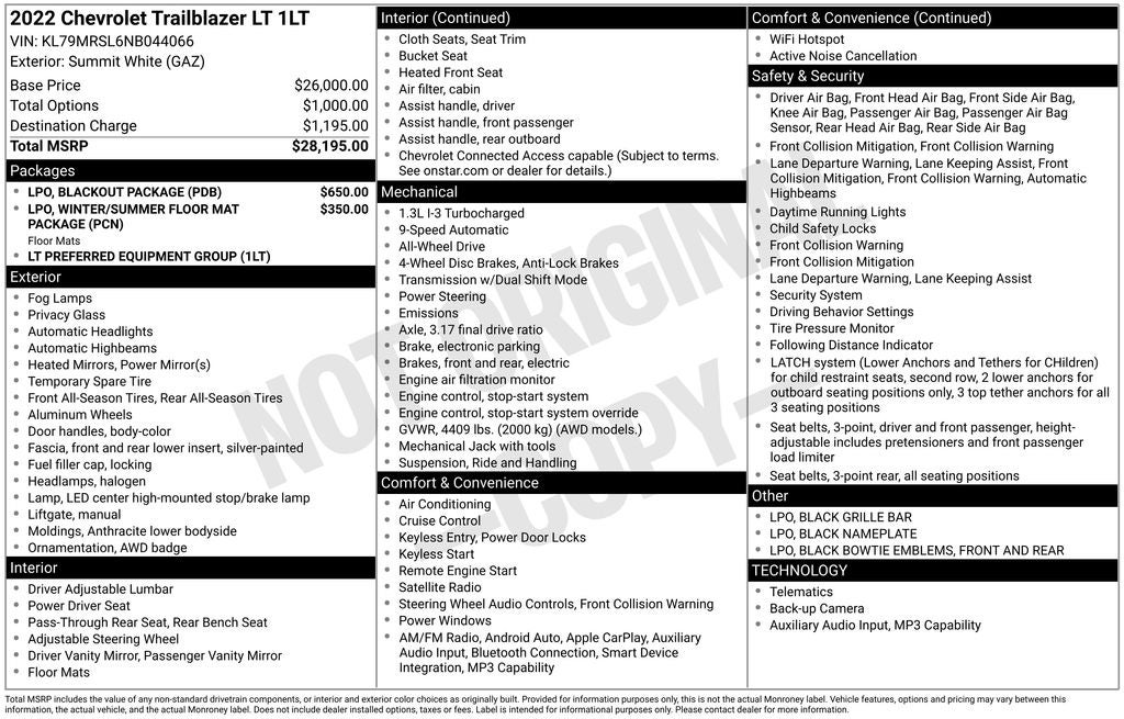 6-Speaker Audio System Feature w/Amplifier, 8-Way Power Driver Seat Adjuster, AM/FM radio: SiriusXM, Auto High-beam Headlights, Black Grille Bar (LPO), Black Nameplate (LPO), Blackout Package (LPO), Cloth Seat Trim, Emergency communication system: OnStar and Chevrolet connected services capable, Exterior Parking Camera Rear, Flat-Folding Front Passenger Seatback, Front & Rear Black Bowtie Emblems (LPO), Front fog lights, Fully automatic headlights, Heated Driver & Front Passenger Seats, Preferred Equipment Group 1LT, Radio: Chevrolet Infotainment 3 System, Remote keyless entry, Ride & Handling Suspension, Security system, Wheels: 17 High Gloss Black Machined Aluminum, Wireless Apple CarPlay/Android Auto.