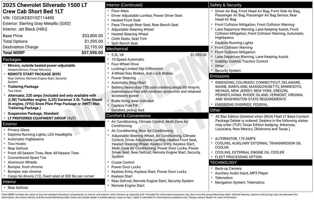 - Convenience Package includes (CJ2) dual-zone automatic climate control, (A2X) 10-way power driver seat including power lumbar, (KA1) heated driver and passenger seats, (N57) wrapped steering wheel, (KI3) heated steering wheel, (KI4) 120-volt power outlet, (KC9) 120-volt bed-mounted power outlet, (UBI) 2 charge-only USB ports for second row, (C49) rear-window defogger, (AVJ) Keyless Open and Start, (BTV) Remote Start, (UTJ) content theft alarm, (N37) Steering column, manual tilt and telescoping and (UF2) LED Cargo Area Lighting (Upgradeable to (A50) bucket seats and includes (D07) center console. Some content is deleted when (RG4) Fleet LT Base Content Package Delete is ordered. The deleted content is as follows; (CJ2) Air conditioning, (A2X) Seat adjuster, (KA1) Seating, heated driver and front outboard passenger, (KI3) Steering wheel, heated, (N37) Steering column, manual tilt and telescoping, and (UF2) LED Cargo Area Lighting.)